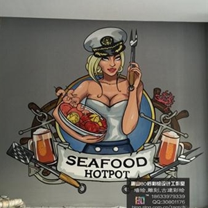 唐山海鲜自助餐厅墙绘,18633979339. 前几天为京唐港9918海鲜火锅绘制的主题壁画。工业风搭配沙滩风,加上主题性壁画,效果很完美。灰色涂料模拟水泥墙面。包间内部各类海鲜插画,楼到处大幅3D壁画。入口处美女涂鸦。在装饰墙面的同时也为主题餐厅烘托不少气氛。唐山餐厅墙绘
