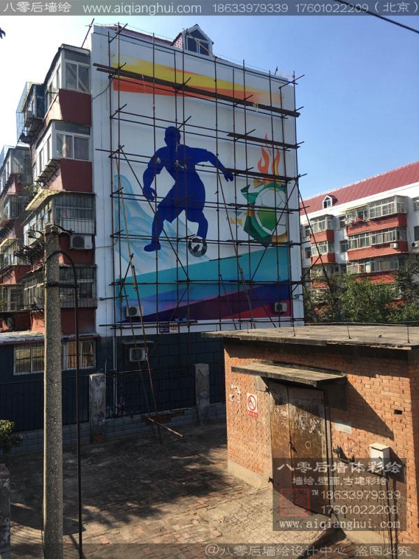 唐山墙体彩绘,18633979339。唐山专业高楼外墙手绘墙案例。本次案例是2019年10月为唐山市乌拉圭足球学校绘制的足球主题手绘墙。案例现场位于足球学校的训练球场旁。共计六栋楼。选取符号化的足球元素作为画面内容。简单大方,装饰性强。球员驰骋球场的不同姿势为主要画面。搭配色块装饰。由于施工现场位于围墙附近,施工过程中。利用九宫格的方式打好辅助线之后。纯手工起稿。每当第一次起稿完成,伙伴们还需要绕一大圈进入球场,从远处看画面结构,再进行调整。十月的唐山依旧烈日当头。伙伴们每天早起晚归。尽可能的躲开中午的时间。在此感谢各位领导的信任,更感谢伙伴们的支持。由于后期足球学校开学,没法再拍更细致的案例照,只有以后找机会了。更多案例查看官网:www.aiqianghui.com